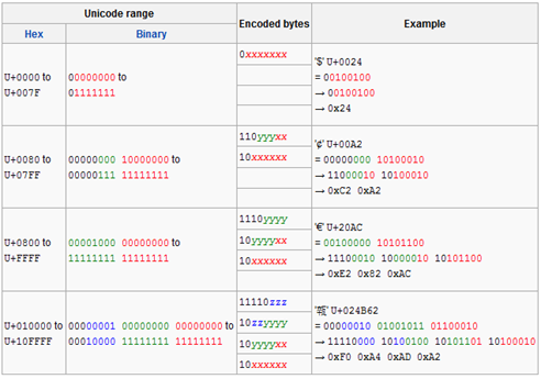 注:上图中的Unicode range即Unicode码点值范围(也就是Unicode码点编号范围),Hex为16进制,Binary为二进制;Encoded bytes即UTF-8编码中各字节的编码方式(即编码算法),其中,x代表Unicode二进制码点值的单字节或低字节中的低7位或8位、y代表两字节码点值的高字节中的低_3位或8位以及三字节码点值的中字节中的8位、z代表三字节码点值的高字节中的低_5位。