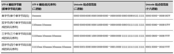因为UTF-8编码中的每个字节中都含有起到区分和标识之用的前缀码0、110、1110以及10之一,所以1~4个字节的UTF-8编码其实际有效位数分别为8-1=7位(2^7-1=127)、16-5=11位(2^11-1=2047)、24-8=16位(2^16-1=65535)、32-11=21位(2^21-1=2097151),如下表所示: